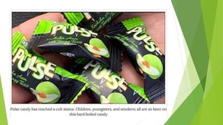 The document summarizes the marketing strategy of Pulse candy, a new entrant in the Indian hard boiled candy market. Pulse was launched by DS Group, a leading manufacturer of snacks and pan masala. It targeted the raw mango flavored hard candy segment, which was dominated by Parle. Through innovative flavors, increased grammage, and aggressive distribution, Pulse gained popularity rapidly through word of mouth. Within 8 months, its sales crossed Rs. 100 crores, making it very successful through social media promotion and engaging packaging despite competition from established brands.