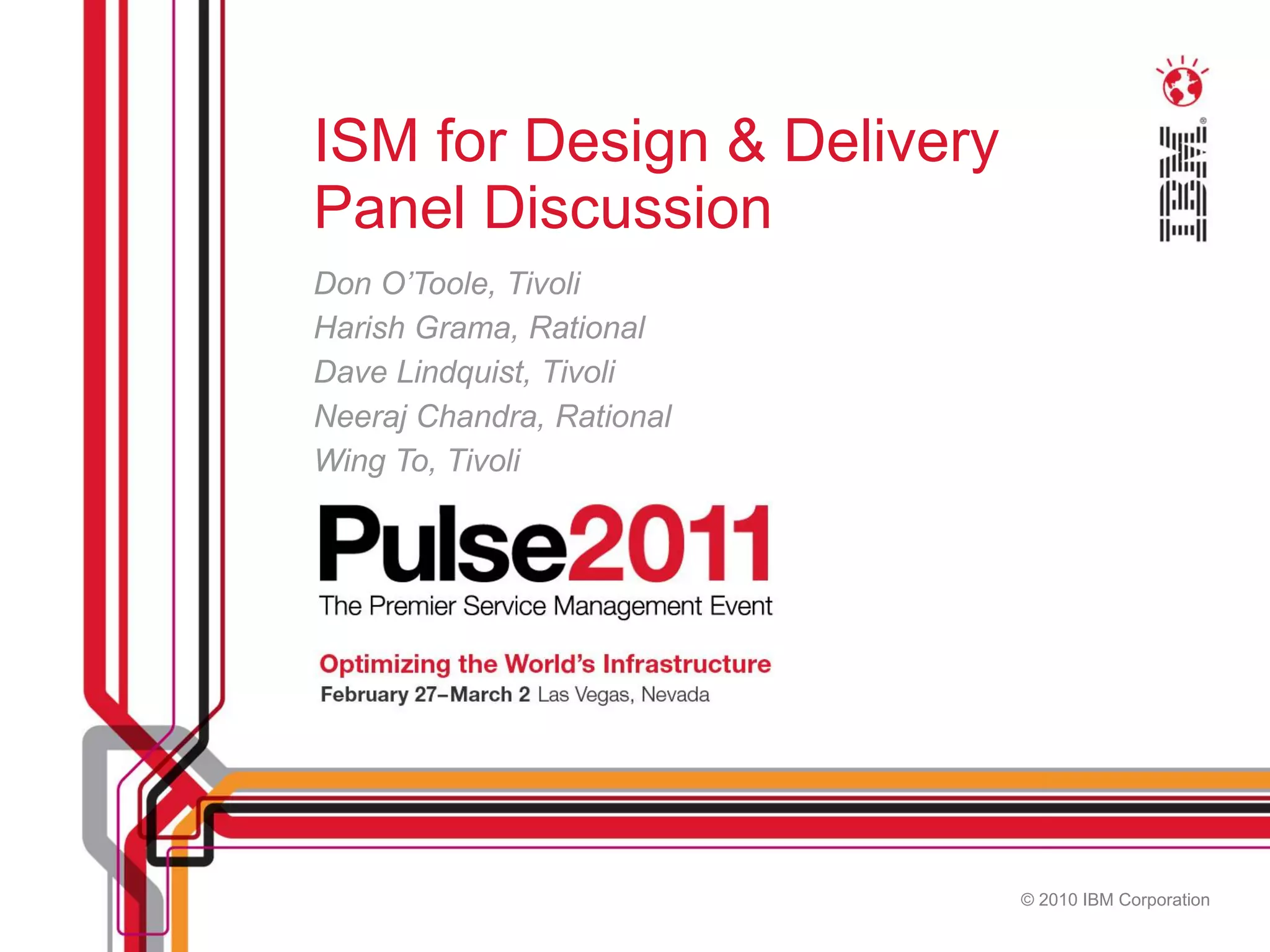 The document summarizes an ISM for Design & Delivery panel discussion with experts from IBM Rational and Tivoli. The panelists were Don O’Toole, Harish Grama, Dave Lindquist, Neeraj Chandra, and Wing To. They discussed how integrating service design, delivery, and management across the lifecycle can enable service innovation through improved visibility, control, and automation. Rational and Tivoli products were highlighted as delivering integrations that bridge gaps in service delivery and enable innovation. Process, people, and technology integration were said to lead to real business service improvements through early problem detection, reduced costs, and performance optimization.