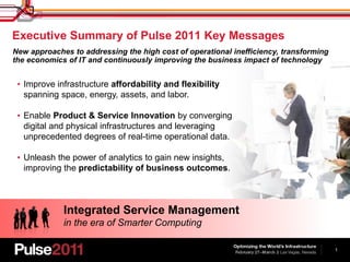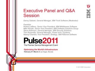 The document summarizes an executive panel and Q&A session at IBM's Pulse 2011 conference. The panelists include senior vice presidents and general managers from IBM divisions focused on middleware, software, security, systems, and rational software.