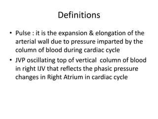 The document provides a review of examining pulse and jugular venous pressure (JVP). It defines pulse as the expansion and elongation of the arterial wall due to blood pressure, and JVP as the oscillating top of blood in the right internal jugular vein reflecting right atrial pressure changes.