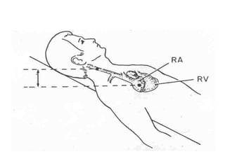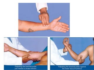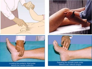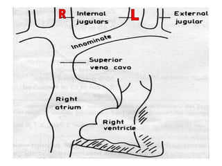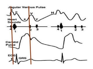 When examining pulse, the rate, rhythm, volume, character, arterial wall condition, and peripheral pulses are assessed. Abnormal rhythms and characteristics like pulsus paradoxus are also described. Examining JVP involves observing the pressure level and waveform pattern. An elevated or changed waveform can indicate cardiac or pulmonary issues. The document outlines how to properly examine both pulse and JVP and interpret the findings.