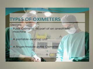The document discusses various aspects of pulse oximetry including types of pulse oximeters, their physiological parameters, uses, advantages, and disadvantages. It also addresses the concept of hypoxemia and the sites for measuring oxygen saturation. Overall, it provides a comprehensive overview of pulse oximetry and its clinical significance.