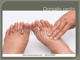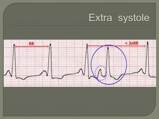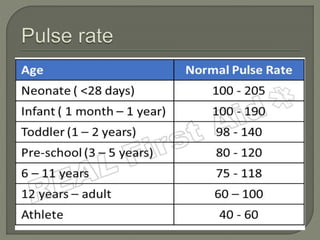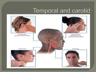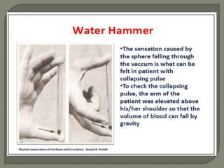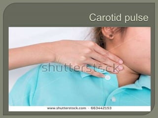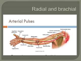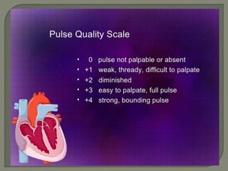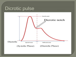 The document discusses pulse, including its definition as the expansion and recoil of arteries caused by blood flow during left ventricular contraction. It notes pulse rate, rhythm, volume, and tension as characteristics and defines an abnormal rate as less than 50 beats per minute. It also defines cardiac arrhythmias and dysrhythmias and lists various normal and abnormal pulse types characterized by low or high tension. The document concludes with an assignment to write a 10 mark response on pulse assessment, covering definition, normal features, and abnormalities.