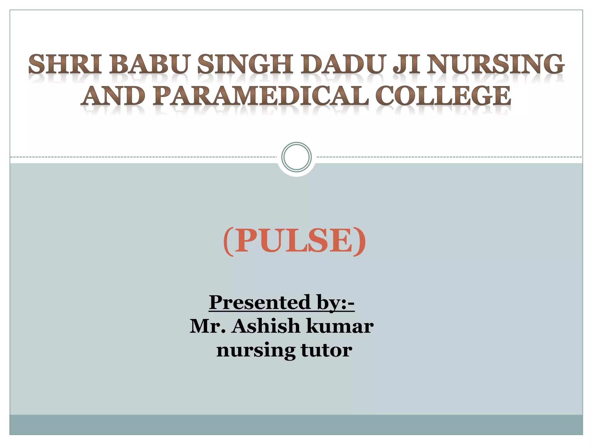 This document defines pulse and discusses its assessment and characteristics. It defines pulse as the alternating expansion and recoil of arteries after each heartbeat. The common sites to take a pulse include the temporal, carotid, apical, radial, femoral, brachial, posterior tibial, popliteal, and pedal arteries. A pulse is normally assessed via palpation or auscultation and is measured in beats per minute, with a normal adult rate of 60-100 bpm. Factors that can affect the pulse rate include medications, exercise, dehydration, stress, temperature, diseases, food intake, and age. Characteristics of a pulse include its rate, rhythm, volume, and the elasticity of the
