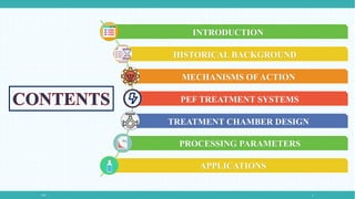 The document discusses Pulsed Electric Fields (PEF) technology as an innovative, non-thermal food processing method that efficiently inactivates microorganisms while preserving food quality. It outlines the fundamental mechanisms, treatment systems, and various applications of PEF, including its role in processing juices, dairy products, and enhancing drying efficiency. The document highlights the advantages of PEF over conventional thermal processing in maintaining sensory and nutritional values of food.
