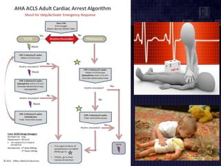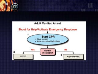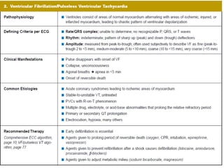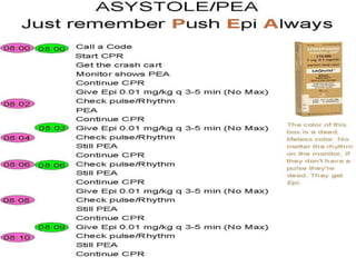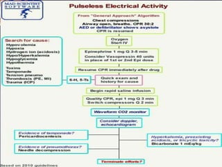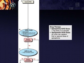 The document summarizes the pulseless arrest (cardiac arrest) algorithm. There are four rhythms seen with pulseless cardiac arrest: pulseless ventricular tachycardia, ventricular fibrillation, asystole, and pulseless electrical activity. PEA and asystole make up half of the algorithm and have poorer outcomes than VF and VT. Positive outcomes depend on high-quality CPR and identifying/treating the underlying cause. Epinephrine and vasopressin are used for PEA, while asystole is treated on the right side of the algorithm. VF is commonly seen in sudden cardiac arrest and is treated with defibrillation, while pulseless VT is also a cause of cardiac arrest