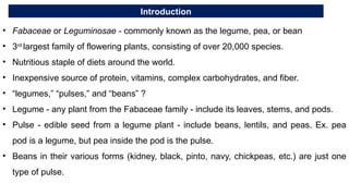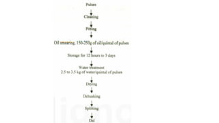 The document provides an extensive overview of legumes and pulses, covering their classification, nutritional composition, and production status. It details the structural components of pulses, their health benefits, antinutritional factors, and the methodologies involved in pulse milling across different scales. Additionally, it discusses the advancements in milling technology aimed at improving efficiency and reducing waste.
