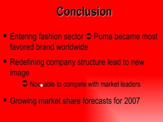 Puma, founded in 1948 by Rudolf Dassler after a split from Adidas, has evolved into a major global sportswear brand with over 7,700 employees and a presence in more than 80 countries. Under CEO Jochen Zeitz, the company has implemented a multi-phase management strategy aimed at brand repositioning, growth, and becoming the most desirable sport lifestyle company. Despite its strengths in R&D and sponsorships, Puma faces challenges like low brand awareness and market penetration.
