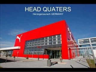 Puma is a Germany-based company that manufactures sports equipment worldwide. It operates in footwear, apparel, and accessories, with product lines for cross training, motorsports, running, soccer, tennis and more. Puma was founded in 1924 and split from Adidas in 1948. It is headquartered in Germany and has over 10,000 employees distributing products in over 80 countries. Puma focuses on driving, racing, casual footwear and apparel, and sponsors Formula One, NASCAR, and is the official sponsor of FIFA World Cup.