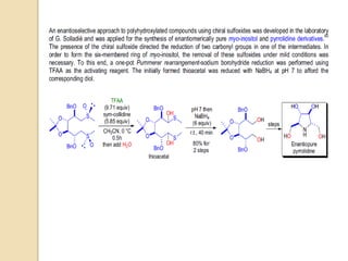 The document summarizes the Pummerer rearrangement, a reaction where sulfoxides undergo rearrangement to form α-substituted sulfides in the presence of an activating reagent like acetic anhydride. The key features of the reaction are described, including the requirement of an α-hydrogen, common activating reagents and catalysts used, products formed, and variants like the seleno- and silyl-Pummerer rearrangements. Drawbacks involving side reactions are also outlined. The document concludes by referencing the original work describing the reaction and several other reviews and applications involving the Pummerer rearrangement.