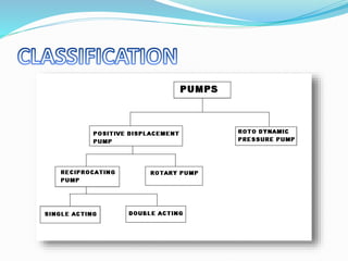 2. Reciprocating pumps are described as having components like a crank, connecting rod, piston, cylinders, suction and delivery pipes, and sump. Their working involves using the crank to move the piston and create suction and pressure cycles to pump liquid.