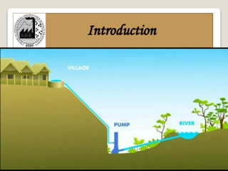 A pump is a mechanical device that transfers rotational energy to liquid to move it from one place to another. There are two main types of pumps: dynamic and positive displacement. A reciprocating pump is a type of positive displacement pump that uses a piston or plunger to trap and move liquid. A rotary pump also positively displaces liquid but does so continuously rather than reciprocating. A centrifugal pump is a type of dynamic pump that uses a rotating impeller to accelerate liquid and convert kinetic energy to pressure energy to move the liquid.