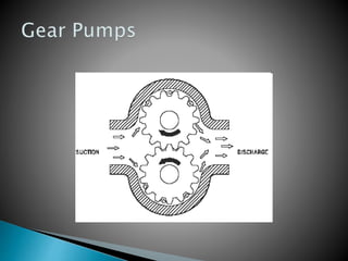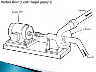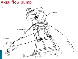 The document discusses various types of pumping systems including their components and operating principles. It describes reciprocating pumps which use back-and-forth motion to displace water, rotary pumps which use gears or vanes for displacement, and centrifugal pumps which use the centrifugal force of an impeller to increase pressure and flow. Specific types like volute and turbine centrifugal pumps are mentioned. Cavitation and net positive suction head are also discussed as important considerations for pump selection and performance.