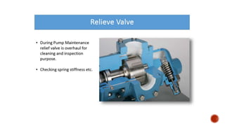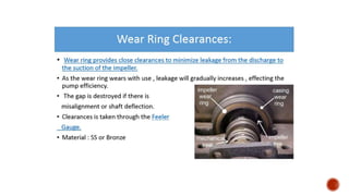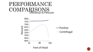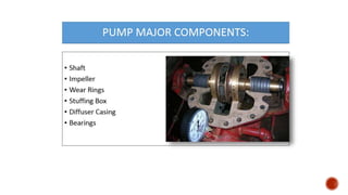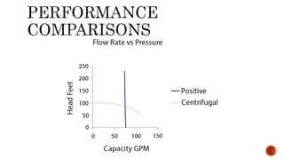 2. Key aspects of pump performance like flow rate, head pressure, horsepower requirements, and efficiency. Affinity laws relating changes in speed and impeller size to performance are also covered.