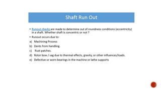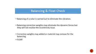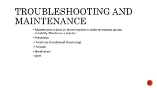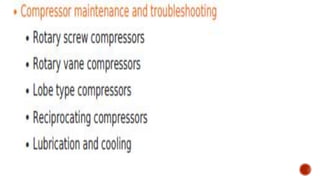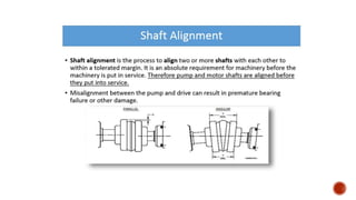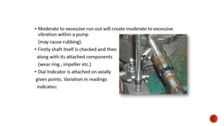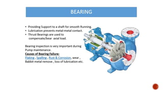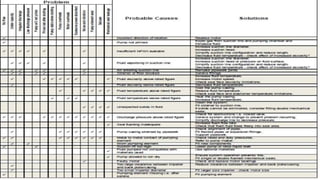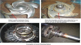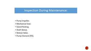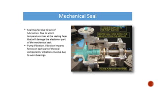 3. Common problems with pumps like low flow, low pressure, excessive power usage, noise, and seal leakage. Potential causes and troubleshooting approaches are provided.