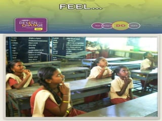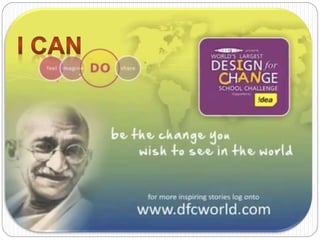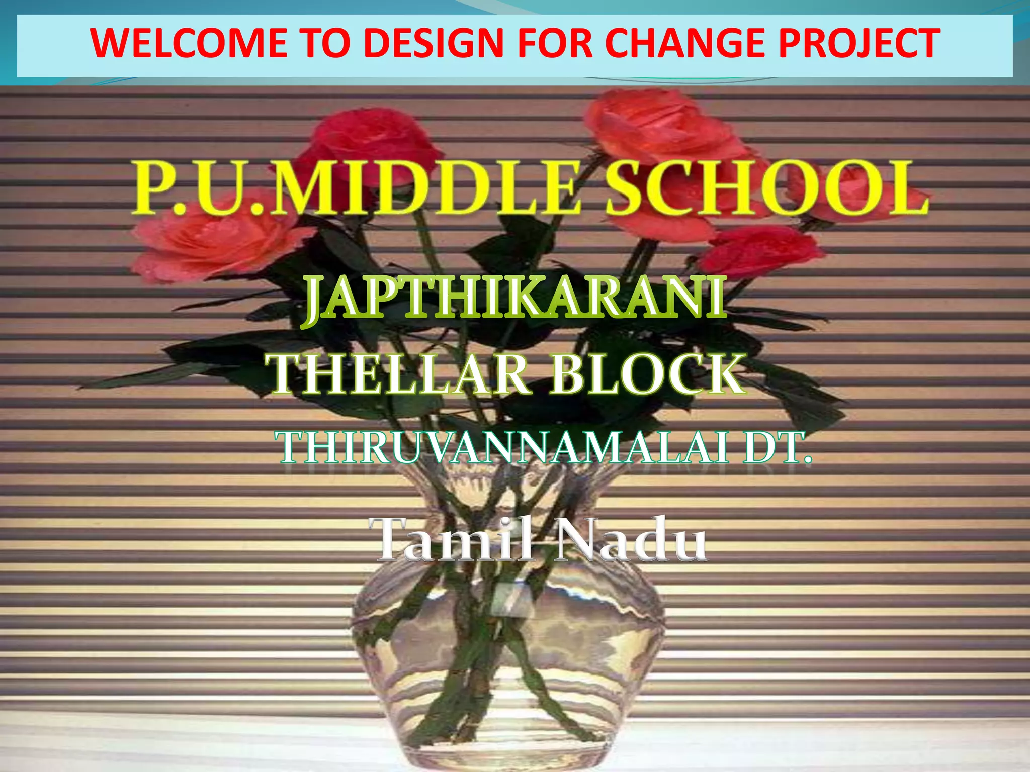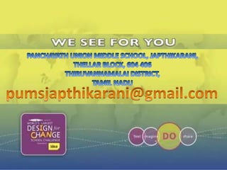 This document provides information about a Design for Change project in Tamil Nadu, India. It lists the names of 21 students (9 boys and 12 girls) in classes 7 and 8 who will be participating. It identifies their guide teacher and provides his contact information. It expresses the students' goal to modernize their classroom and says they will ask their school headmistress for permission to make changes to their classroom. It thanks the school for giving the students a chance to work on this project.