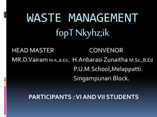 1. The document discusses a waste management program held at P.U.M School in Singampunari Block for students of classes 6 and 7.