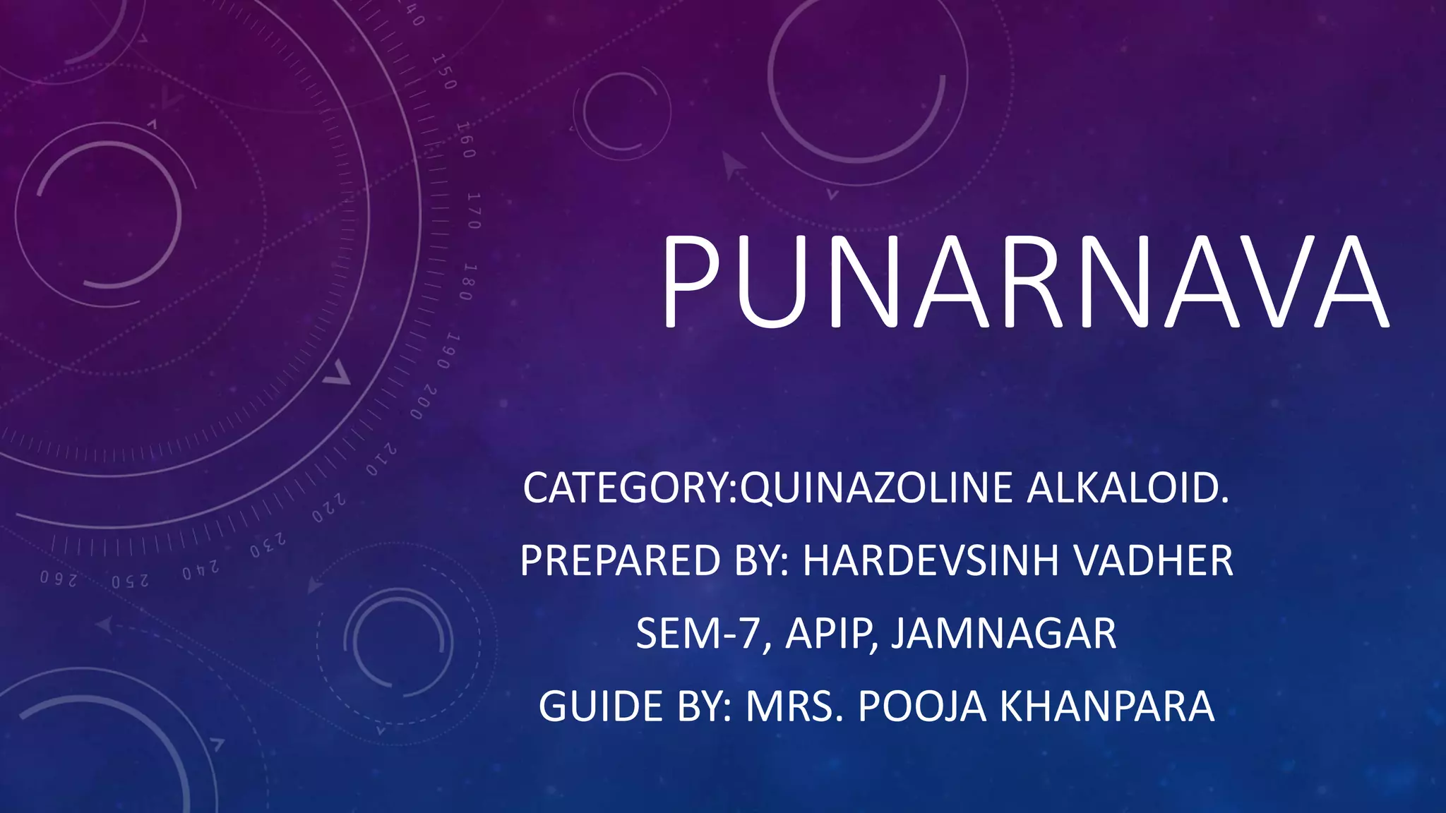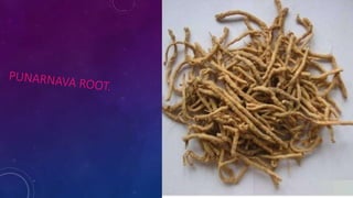 Punarnova is a plant with bitter leaves that are green on the upper surface and white on the lower. It has pink flowers and produces small, one-sided fruits. The plant contains chemicals like punarnavin, B-sitosterol, and ursolic acid. It is used to treat conditions like edema, inflammation, and as a liver tonic. Some formulations containing punarnova include Ashoka nari, Punarnava Tablet, Aksir afza, and punarnavarishta.