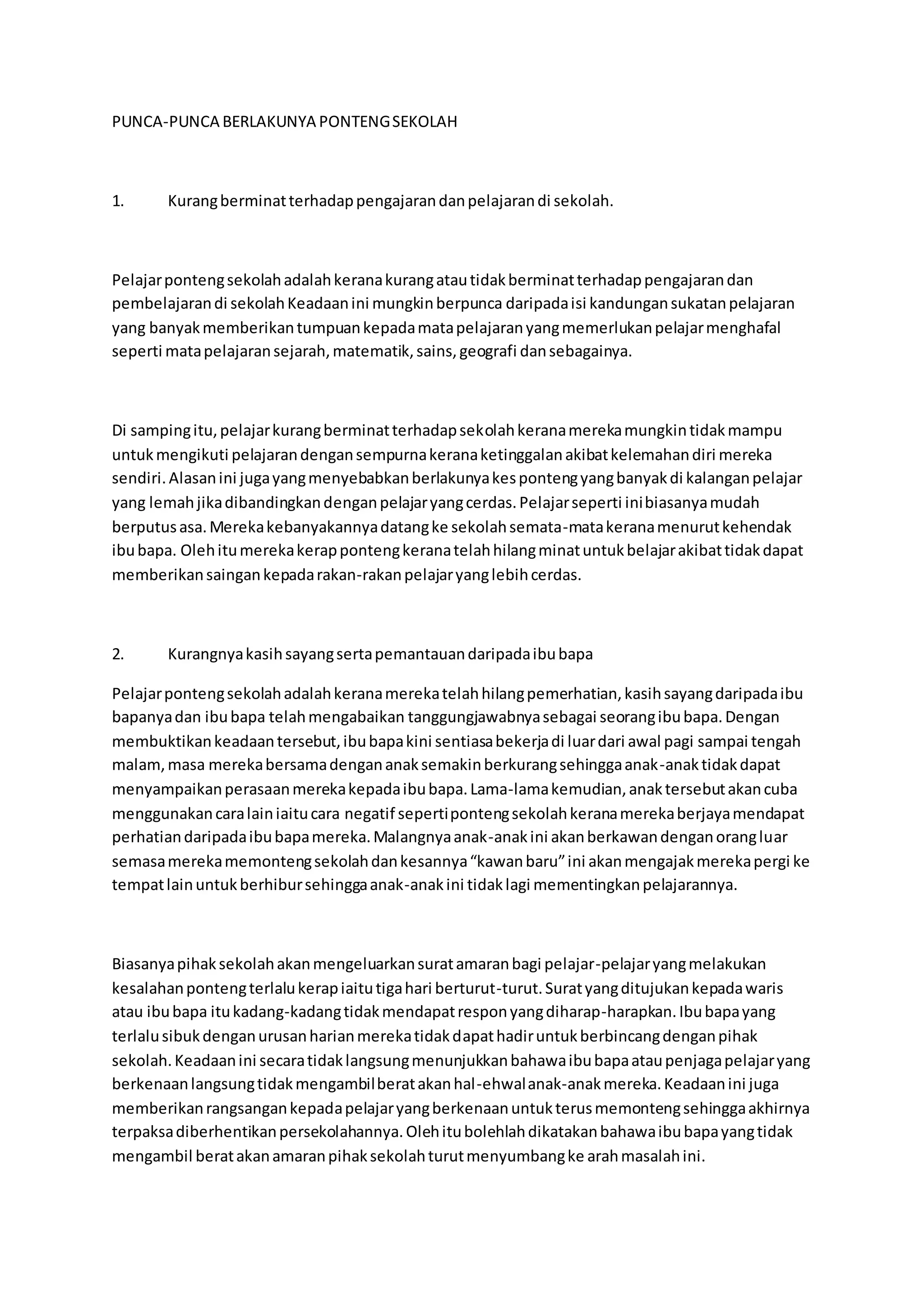 Dokumen ini membincangkan pelbagai punca berlakunya ponteng sekolah di kalangan pelajar, termasuk kurangnya minat terhadap pembelajaran, pengaruh rakan sebaya, dan ketidakcekapan dalam didikan oleh ibu bapa. Selain itu, faktor seperti keadaan ekonomi keluarga dan peraturan sekolah yang ketat turut menyumbang kepada masalah ini. Penekanan diberikan kepada keperluan kerjasama semua pihak dalam mencari penyelesaian kepada isu ponteng sekolah yang semakin menjadi-jadi.