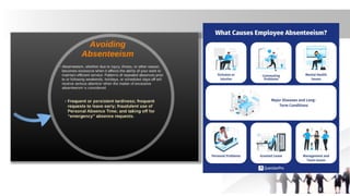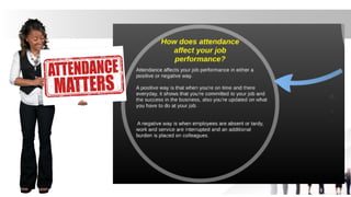 Punctuality refers to being on time for obligations, while tardiness signifies the opposite. It is crucial in the workplace as it reflects professionalism, impacts colleague workload, and is a key factor in performance evaluations. Overall, punctuality establishes a reputation of reliability and dependability.