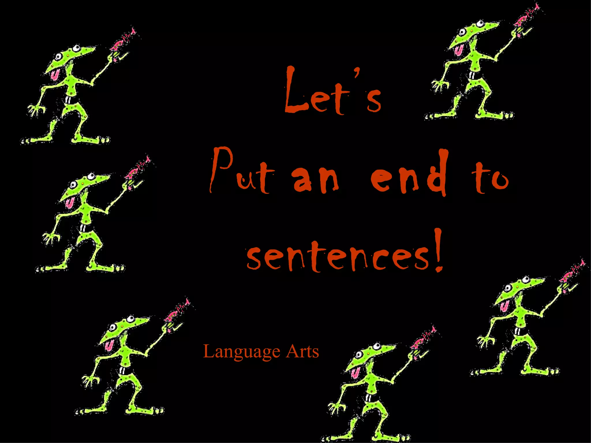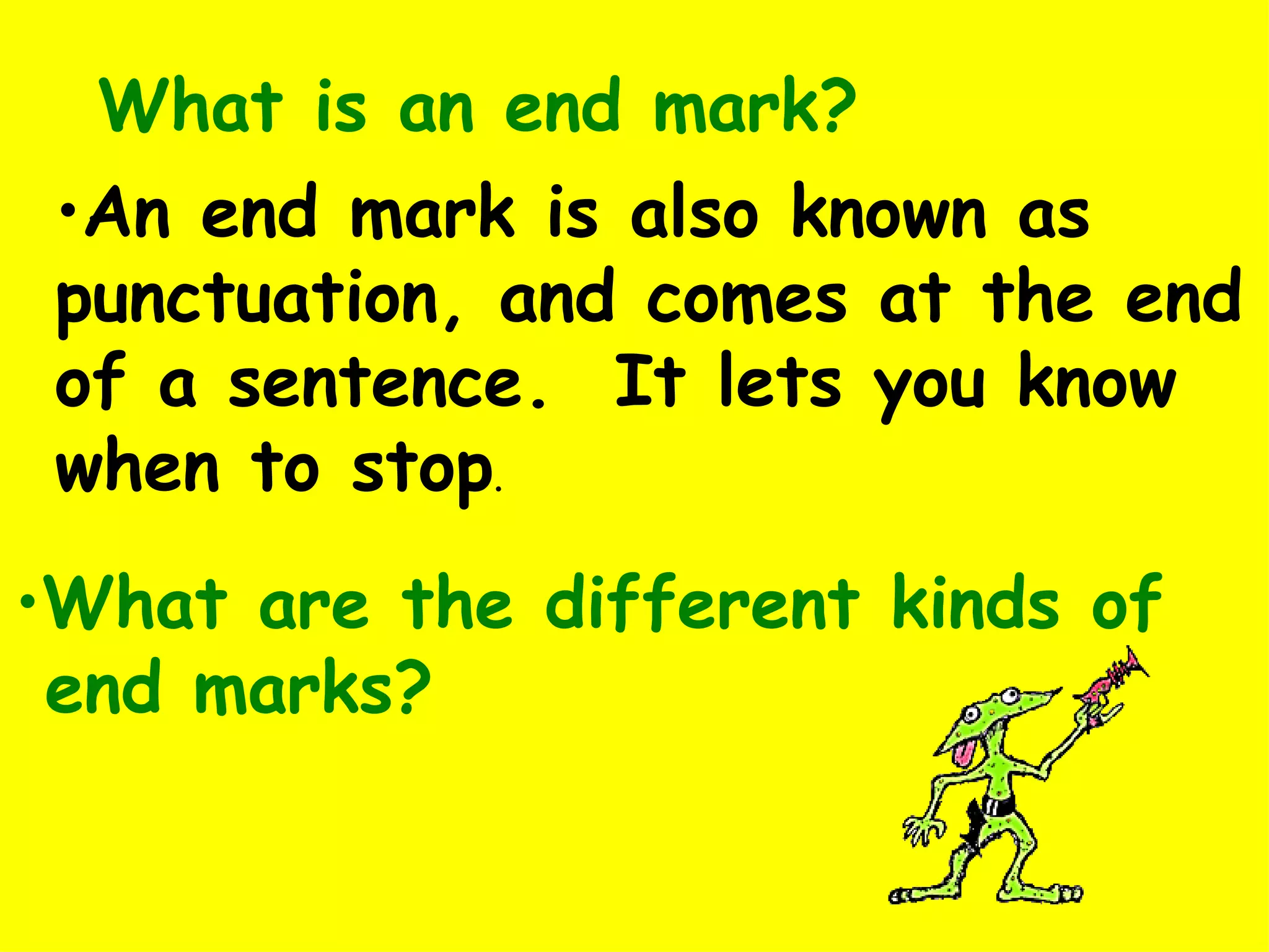 This document discusses different types of punctuation marks used at the end of sentences, including periods, exclamation points, and question marks. It explains that end marks let the reader know when to stop and provide cues about the tone or meaning. The document also contains examples of using each type of end mark correctly based on whether the sentence is a statement, question, command, or expresses excitement. It concludes with a rhyming "punctuation rap" that reviews the basic uses and rules for end marks and several other punctuation marks.