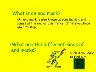 This document discusses different types of punctuation marks used at the end of sentences, known as end marks. It describes the period, exclamation point, and question mark as the main end marks and what they indicate. It also mentions other punctuation marks like the colon and comma, explaining their uses in sentences and formatting. The document uses examples and a rhyming "Punctuation Rap" to teach about proper punctuation.