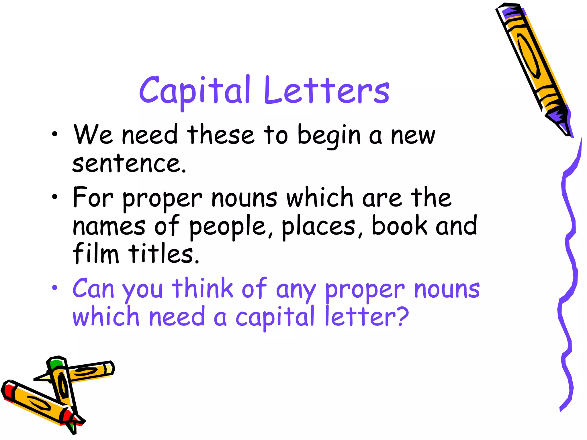 This document provides an overview of different types of punctuation, including capital letters, full stops, commas, question marks, speech marks, and exclamation marks. It explains the purposes of each type of punctuation and provides examples of their proper uses in writing sentences and dialogue. The document concludes by instructing readers to check their own writing for correct punctuation using the punctuation check list.