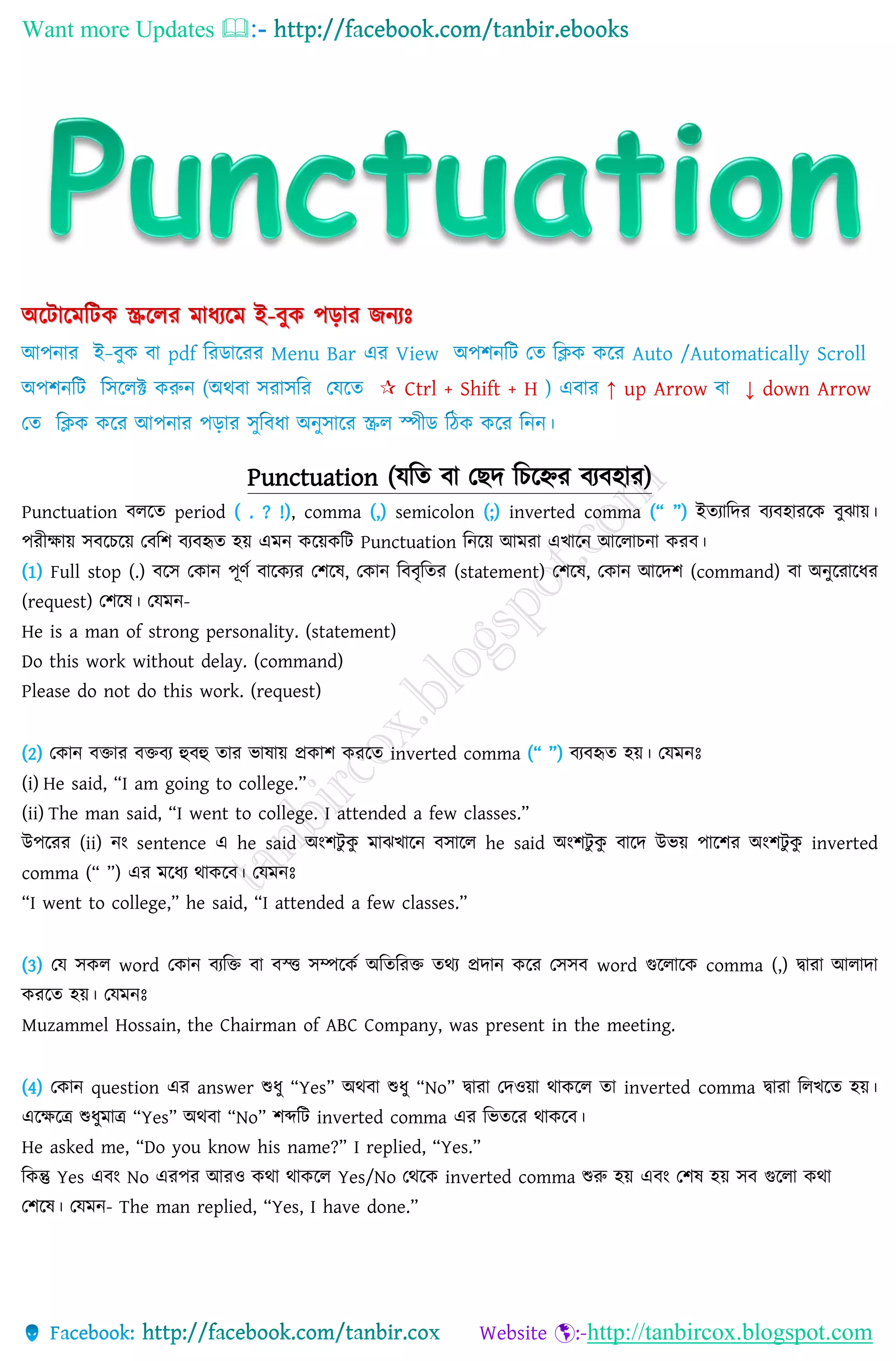 1) The document provides instructions on proper punctuation usage in Bangla, including periods, commas, question marks, quotation marks, apostrophes, and capitalization rules.