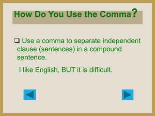 This English lesson covers punctuation rules for 9th grade students. It discusses the proper use of commas, semicolons, apostrophes, quotation marks, hyphens, parentheses, capital letters, full stops, exclamation points, and question marks. Examples are provided to illustrate when to use each punctuation mark correctly in sentences. The lesson concludes by listing references used to develop the material presented.