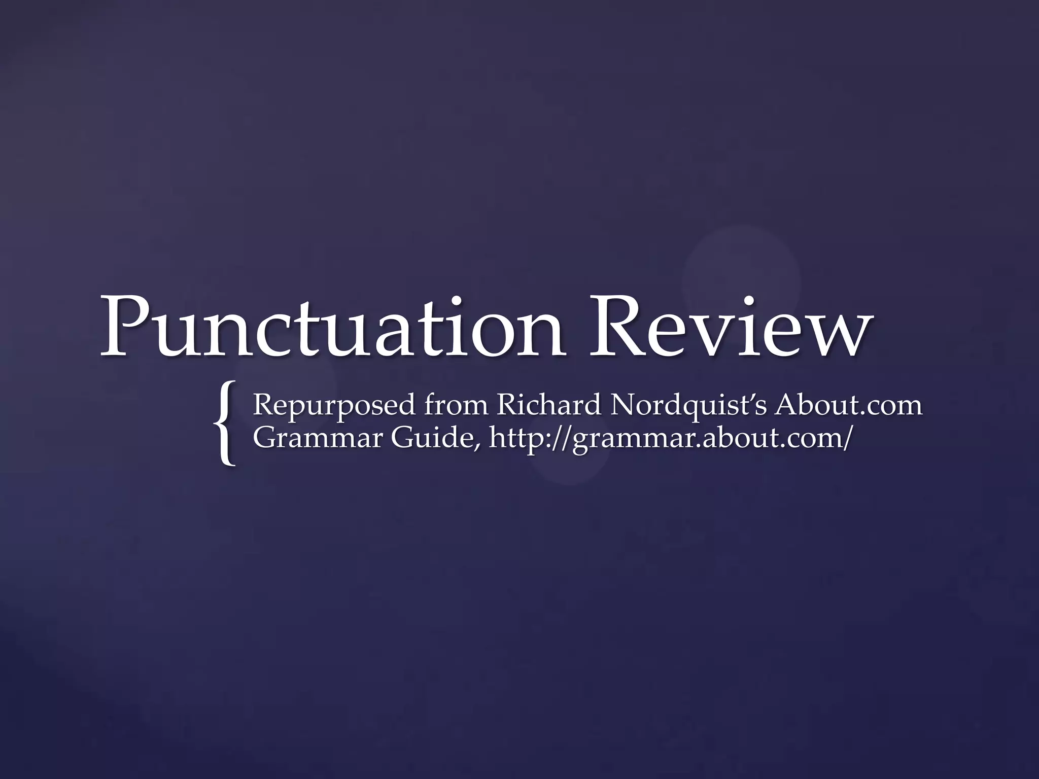 The document provides an overview of punctuation rules for ending sentences, using commas, semicolons, colons, dashes, quotation marks, and provides examples of correctly and incorrectly punctuated sentences. It discusses ending sentences with periods, question marks, or exclamation points. It also covers using commas before coordinating conjunctions linking two main clauses, in a series of three or more items, after introductory phrases, and to set off interruptions. Semicolons are used to separate two independent clauses not joined by a conjunction. Colons are used before a list or summary. Dashes set off interruptions with extra information. Quotation marks are used for direct quotations and titles.