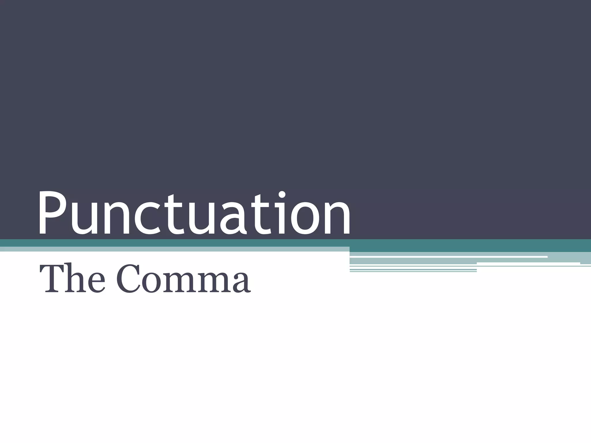 This document discusses the rules for using commas in sentences. It outlines 11 main comma rules, such as using commas to separate elements in a list, set off introductory phrases, and separate two independent clauses joined by a conjunction. The rules also cover using commas around quotations, between a city and state, date and year, and in greetings/closings of letters. The document concludes by listing some incorrect uses of commas, such as separating subject from verb or verbs in a compound predicate.