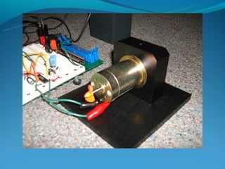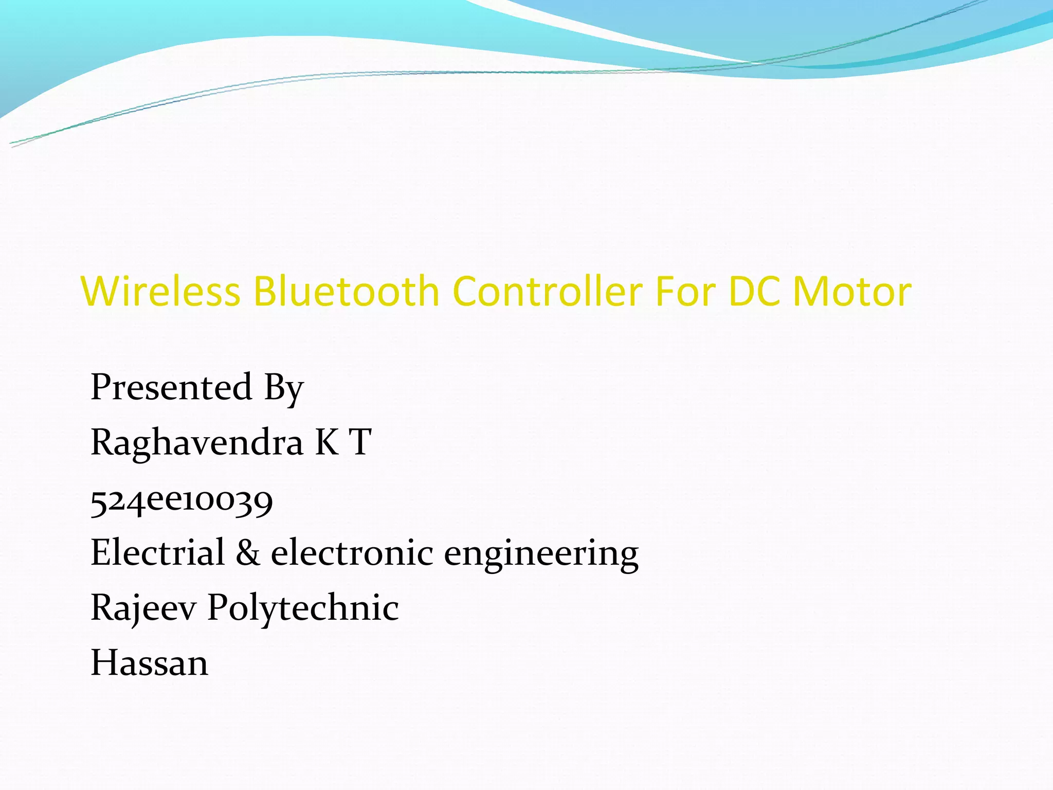 This document describes a wireless Bluetooth controller for controlling the speed of a DC motor. It uses Bluetooth wireless technology to send speed control signals from a user interface to a microcontroller, which then translates the desired speed to a duty cycle to control an H-bridge and drive the motor. The system was able to control the motor bidirectionally between 0-95 RPM and test results showed it could accurately control speed and achieve a maximum continuous load of 15W and torque of 1.33 N-m. Potential applications include robotics, remote control vehicles, and industrial and household uses.