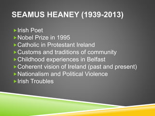 Seamus Heaney was an Irish poet who won the Nobel Prize for Literature in 1995. His poem "Punishment" was inspired by the archaeological discovery of a preserved bog body in Denmark from the Iron Age. In the poem, Heaney imagines the perspective of a young woman who was killed as punishment, possibly for sexual relations with British soldiers during the ethno-nationalist conflict in Northern Ireland in the 1960s, when Irish nationalists punished those seen as sympathizing with the British. The bog was used as a mass grave for outcasts and victims of ritual or judicial executions in Irish history and tradition.