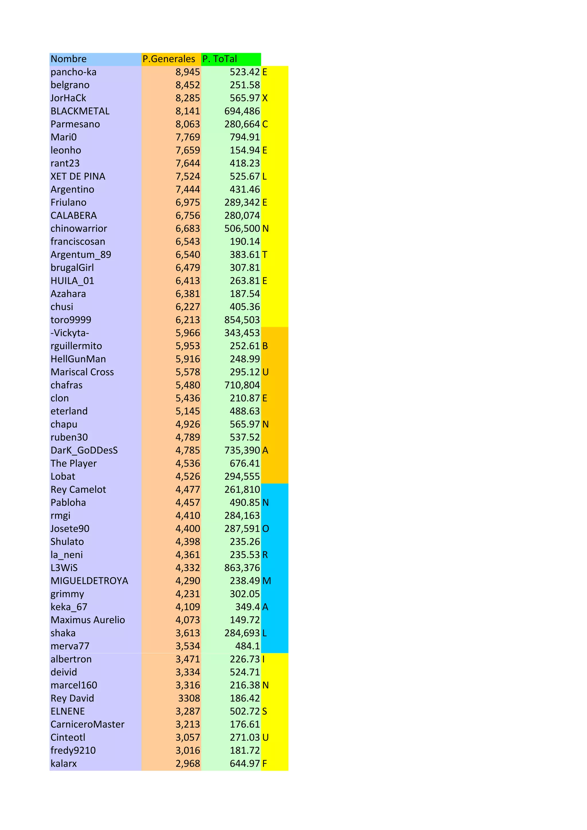 This document contains a list of names along with their general points and total points. The top name, "pancho-ka", has 8,945 general points and 523.42 total points. Many other names and their respective points are listed as well. The document provides statistics on points for what appears to be players or members of a group.