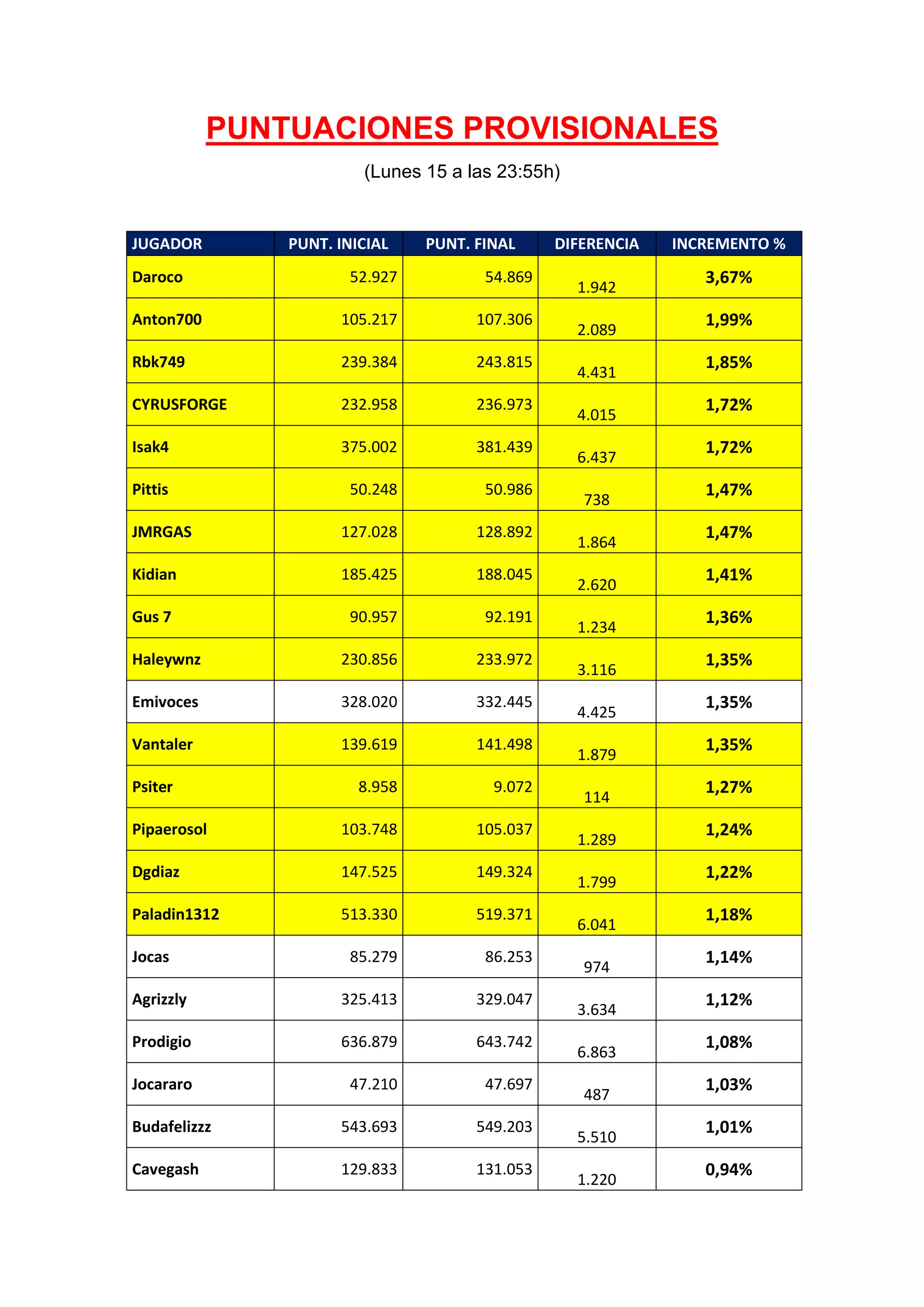 This document lists the provisional scores of players in a game, along with their initial score, final score, point difference, and percentage increase. The top player increased their score by 6,437 points (1.72% increase) while some at the bottom did not change their score at all (0% increase).