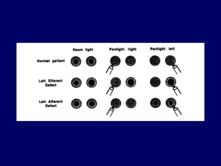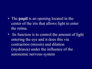 The document provides a comprehensive overview of the pupil's anatomy, function, and the pathways involved in pupillary reflexes, discussing both parasympathetic and sympathetic pathways. It also outlines various pupillary examinations and tests, as well as abnormalities such as anisocoria, Adie's tonic pupil, and Horner's syndrome, with their diagnostic implications. Lastly, it touches on congenital and acquired abnormalities affecting the pupil and the impact of pharmacological agents on pupillary reactions.
