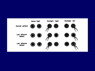 The pupil is a circular opening located in the center of the iris that controls the amount of light entering the eye. It constricts (miosis) and dilates (mydriasis) under autonomic nervous system influence. The iris contains two sets of muscles - the sphincter pupillae contracts the pupil in response to parasympathetic stimulation while the dilator pupillae dilates it with sympathetic stimulation. Abnormal pupils may be unequal in size (anisocoria), irregularly shaped, or have abnormal reactions to light. Various diseases and drugs can affect the pupils.