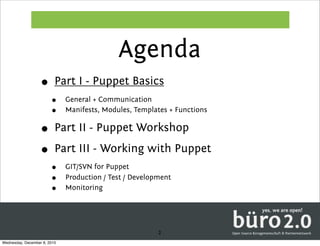 This document provides an overview and agenda for a Puppet workshop. Puppet is an automated system configuration management tool. The workshop agenda includes installing and initializing Puppet, creating modules for user management and Apache site configuration, using templates, and setting up reporting and a dashboard. The document explains Puppet concepts like manifests, modules, templates, and functions. It also provides examples of Puppet configuration language and directory structures for modules.
