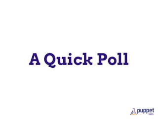 This document provides an overview of Puppet, an open source configuration management tool. It summarizes Puppet's key components like the Puppet Master, agents, Facter, Hiera and PuppetDB. It also outlines Puppet Enterprise features like interactive reporting, resource browsing and cloud provisioning. Finally, it encourages engagement with the Puppet community through contributing code/modules, asking questions, helping with documentation and attending training.
