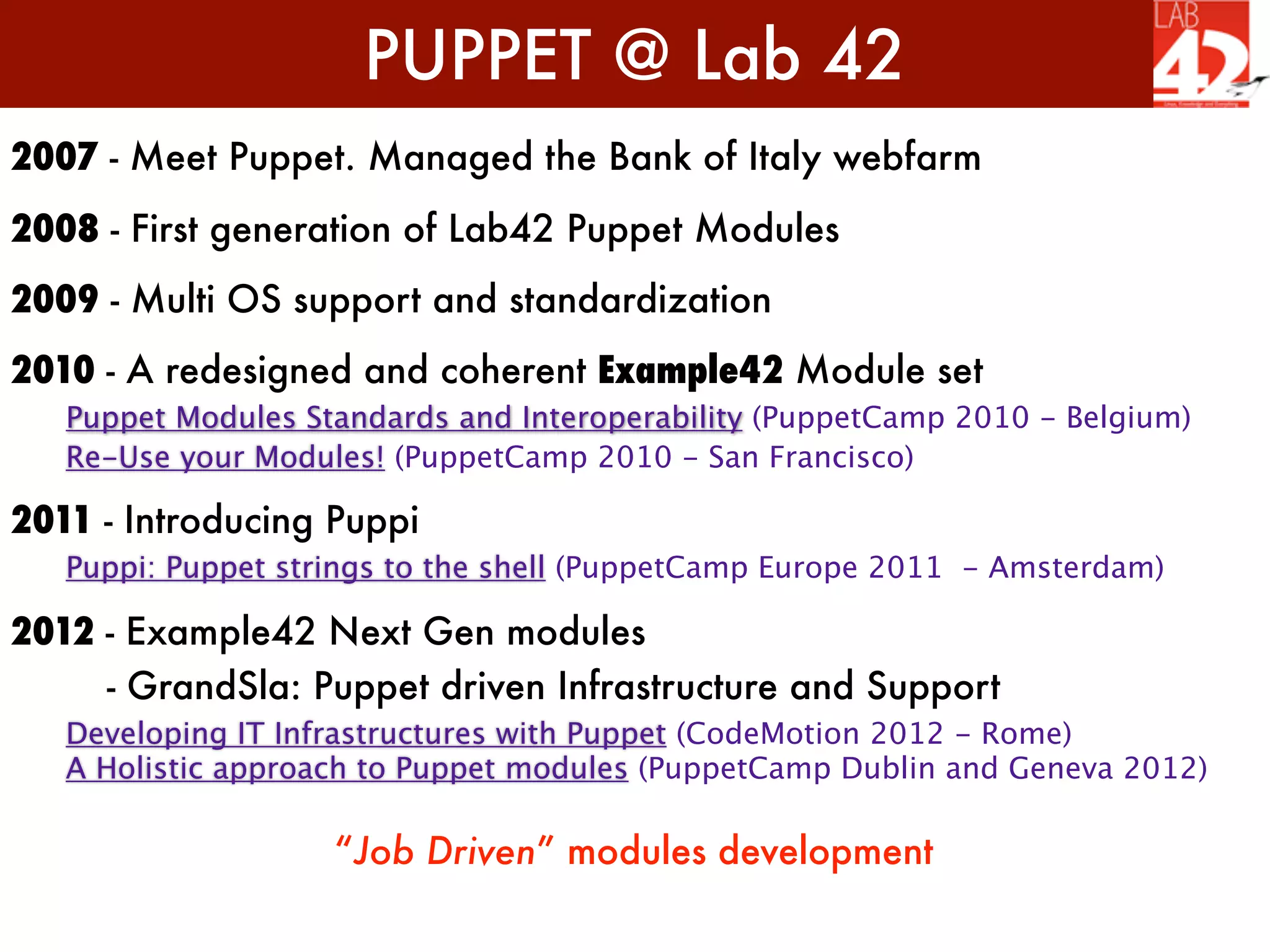 This document discusses Puppet modules and provides examples of how to structure modules to allow for customization and reuse. It outlines 10 design rules for Example42 modules, including separating configuration data from module logic, providing choices for configuration file supply, configuring with defaults but allowing customization, and allowing management of general module behavior. The document provides code examples demonstrating how to implement these rules in Puppet modules.