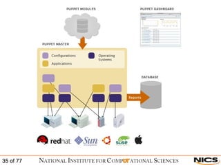 This document discusses using Puppet for scalable systems management. It begins with challenges faced by system administrators and an introduction to Puppet. It covers installing and configuring Puppet, including certificate signing. It also discusses managing infrastructure with Puppet through classes, modules, and templates. Examples of Puppet configuration are provided.