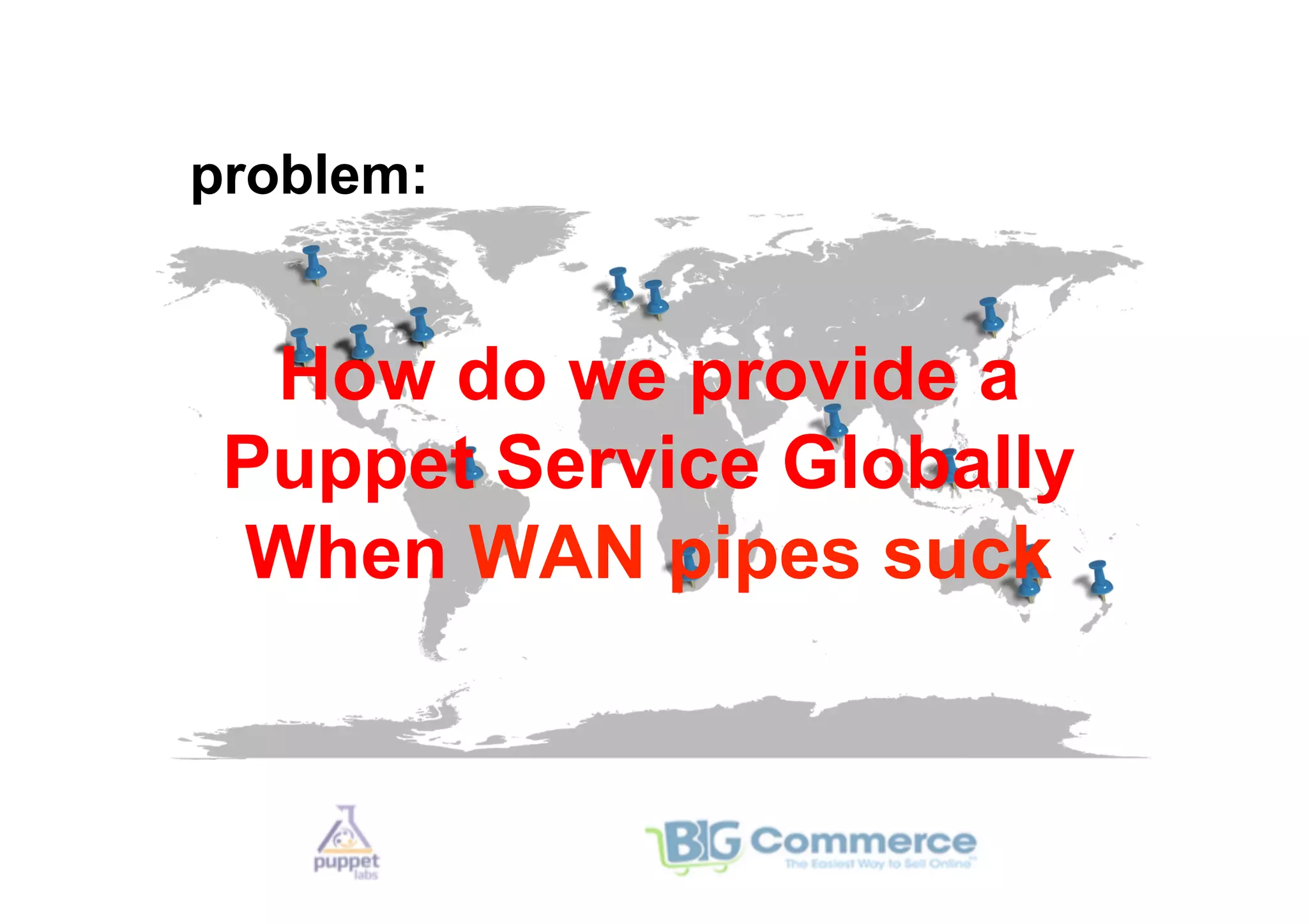 This document discusses a solution for providing Puppet services globally across multiple regions with poor WAN connectivity. The solution involves building a "Puppeteer" master that acts as a central point of entry for code updates and certificate management. It ensures Puppet masters in each region are in sync. LDAP is used as an external node classifier to provide node definitions across regions. The Puppet file server replicates configuration between masters. F5 load balancers route clients to the nearest master and provide high availability if any master fails. Workflows for adding new servers and masters are also summarized.