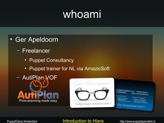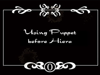 The document provides an introduction to Hiera, a hierarchical data store used in Puppet configurations. It discusses how Hiera allows for flexible organization and override of configuration data. Specific use cases shown include setting different smarthost values for most hosts but overriding it for one host and the DMZ. The presentation recommends starting with a simple Hiera implementation and expanding from there, and provides tips on determining hierarchy and using Hiera data in Puppet modules.