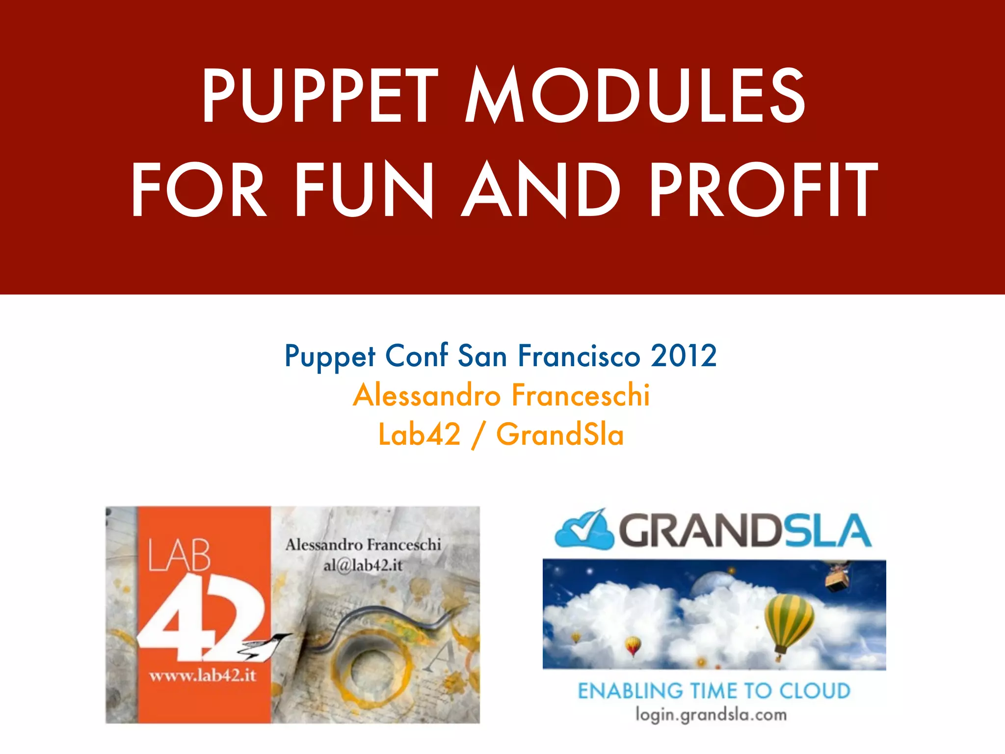 The document discusses the development and best practices for Puppet modules, particularly from the perspective of Alessandro Franceschi and Lab42. It outlines a series of design rules for creating reusable, customizable modules and emphasizes the importance of data separation, interoperability, and consistent documentation. Additionally, it provides examples of configuration and management techniques to improve modularity and compatibility across different operating systems and environments.