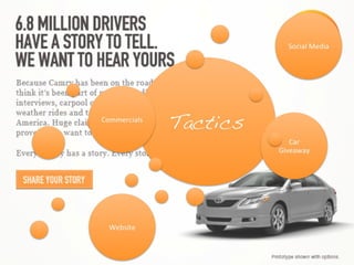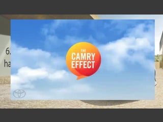 The document summarizes Toyota's "Camry Effect" marketing campaign from November 2011 to March 2012. The $175 million campaign was designed to promote Toyota's 2012 Camry model and increase sales following decreased profits from the 2011 Japanese earthquake. Key elements included a Super Bowl commercial partnership with Shazam, social media promotion, and a "Give a Friend" contest where the winner received two Camrys. The campaign was a success, with January 2012 Camry sales up 7.5% and projections of a 16% annual sales gain.