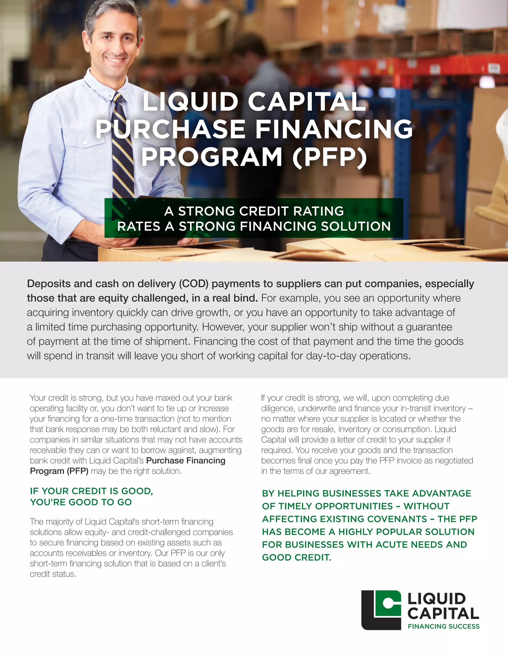 The document outlines Liquid Capital's Purchase Financing Program (PFP), designed for companies with strong credit that need immediate financing for supplier payments without tying up existing capital. It provides a streamlined solution to help businesses acquire inventory quickly while maintaining working capital flexibility. The program reduces financing challenges and allows for favorable purchasing terms without complicated agreements or hidden costs.