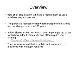 The document discusses the outdated nature of the purchase request process, which has largely remained unchanged for 100 years despite the prevalence of electronic solutions that introduce complexity and require training. It proposes a new mobile-friendly format that simplifies the process and offers a more intuitive design for approvers to access necessary information easily. The new approach aims to improve efficiency in purchasing while ensuring that detailed supplier and spend data is readily available for better decision-making.