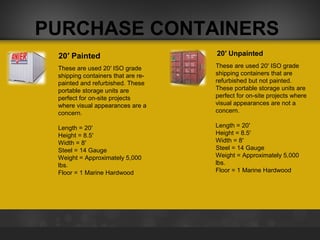 Anjer offers 20' and 40' heavy-duty storage containers for sale or lease, with options for customization such as additional doors, paint, and office conversions. The containers are refurbished used ISO grade shipping units, available in painted and unpainted versions, suitable for various on-site projects. Contact information is provided for inquiries, and lease-to-own options are also available.