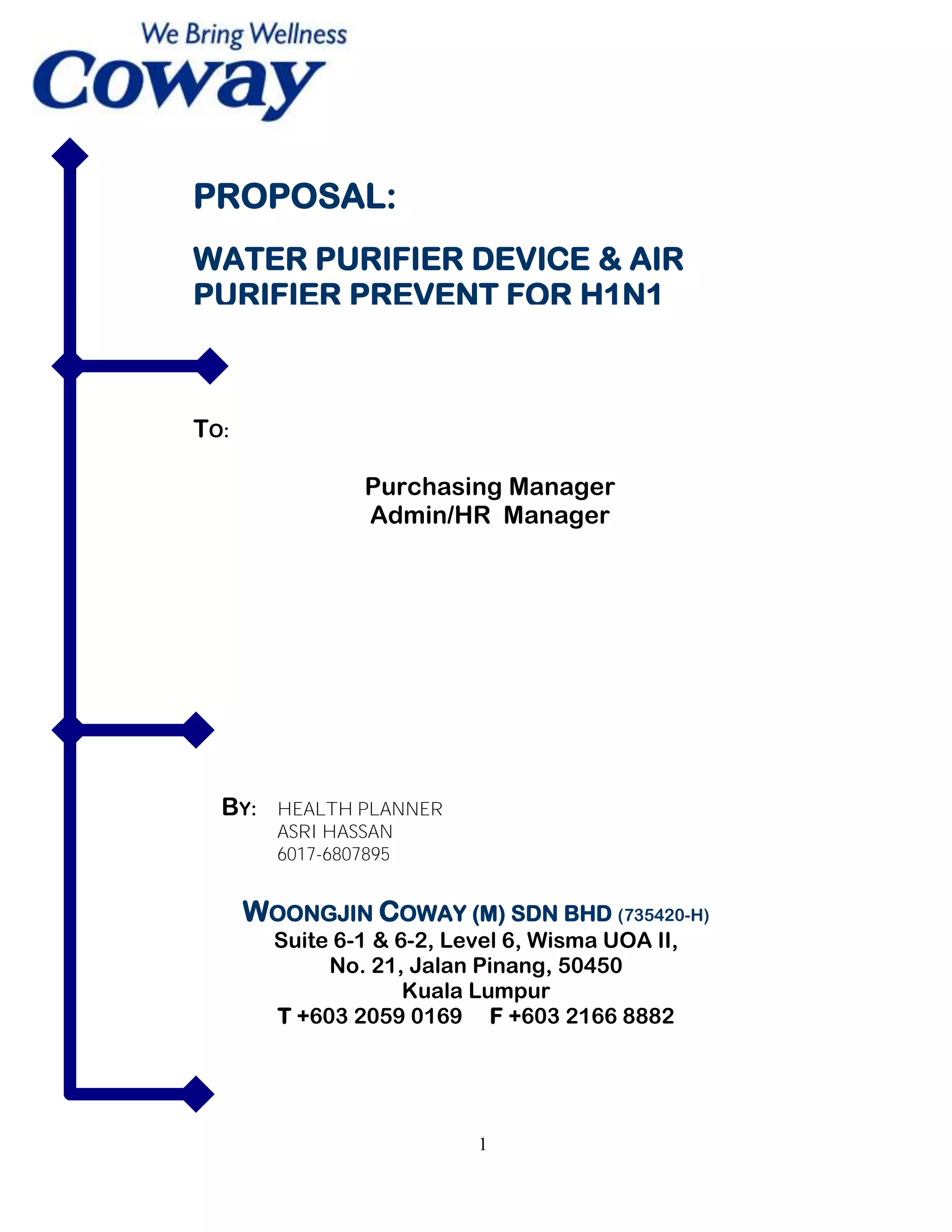 The document is a proposal from Woongjin Coway (M) Sdn Bhd to provide water purification and air purification systems to a potential client. It outlines the benefits of Coway's systems, such as providing pure water without plastic bottles and improving air quality. It compares Coway's systems to competitors and bottled water. The proposal includes technical specifications and highlights Coway's service and maintenance support. It aims to showcase how Coway's products and services can enhance the client's office environment and save costs over time.