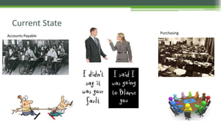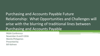 The document discusses the evolving relationship between purchasing and accounts payable (AP), highlighting the blurring of traditional roles due to technology, globalization, and a focus on electronic payments. It outlines the challenges and opportunities this transformation brings, including the need for new skills and shared metrics while emphasizing the importance of accurate purchase orders and effective communication between teams. The document suggests that a unified approach could enhance efficiency and collaboration, ultimately leading to better management of finances and supplier relationships.